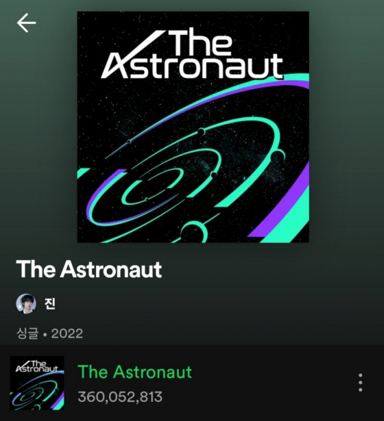 방탄소년단(BTS) 진의 솔로곡 '디 애스트로넛'(The Astronaut)이 스포티파이에서 3억 6000만 스트리밍을 돌파하며 막강 음원파워를 빛냈다.