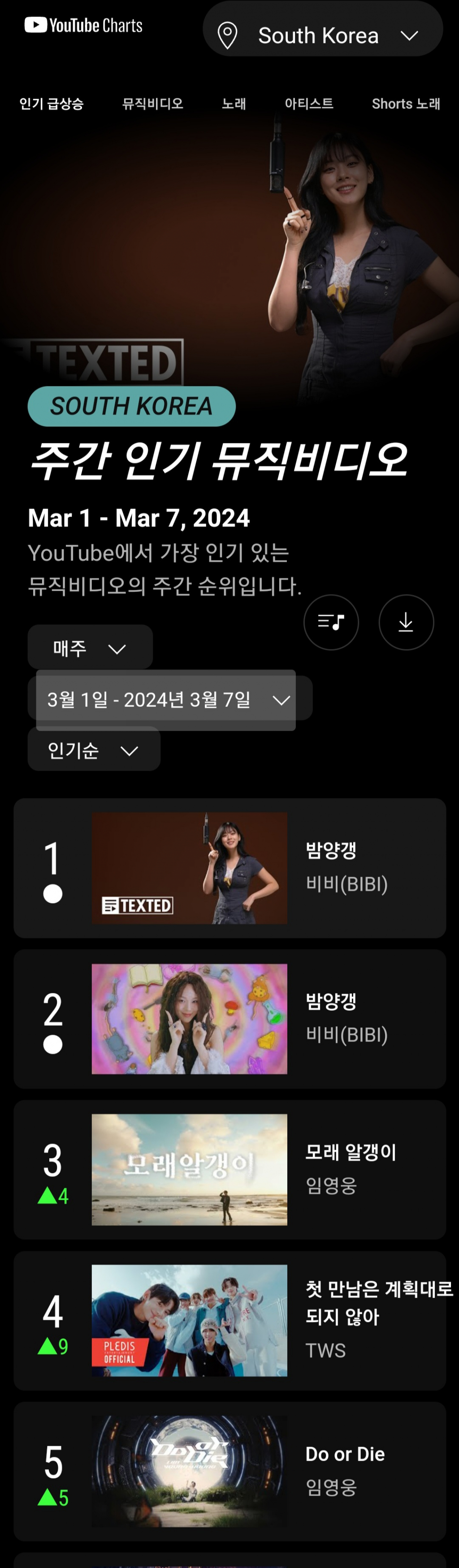 가수 임영웅이 유튜브 주간 인기 뮤직비디오 차트 톱3에 오르며 인기를 빛냈다.