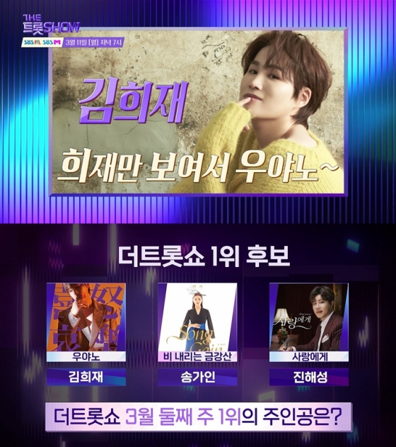 11일 생방송으로 펼쳐지는 SBS FiL과 SBS M '더 트롯쇼'에 김희재, 송가인, 진해성이 1위 트로피를 두고 경합을 벌인다.