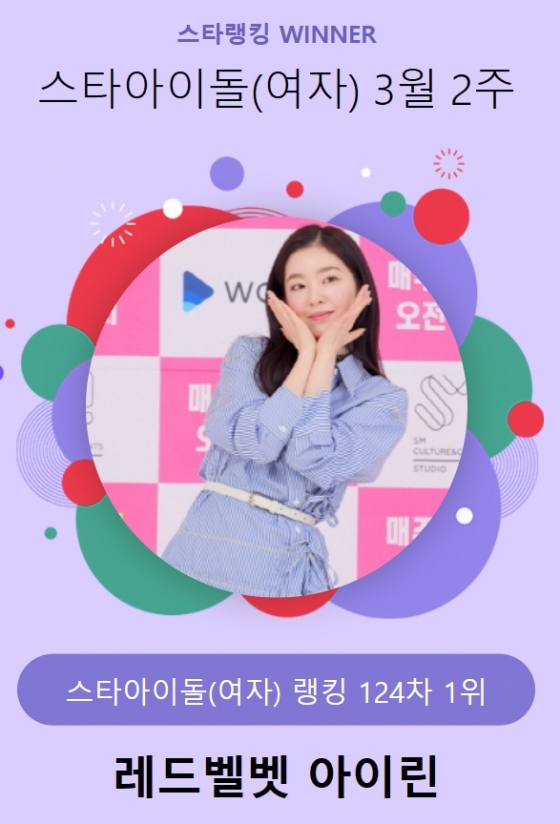 아이린은 지난 7일 오후 3시 1분부터 14일 오후 3시까지 진행된 3월 2주(124차) 스타랭킹 스타아이돌 여자 랭킹 투표에서 소녀시대 윤아, 태연을 꺾고 1위를 차지했다.