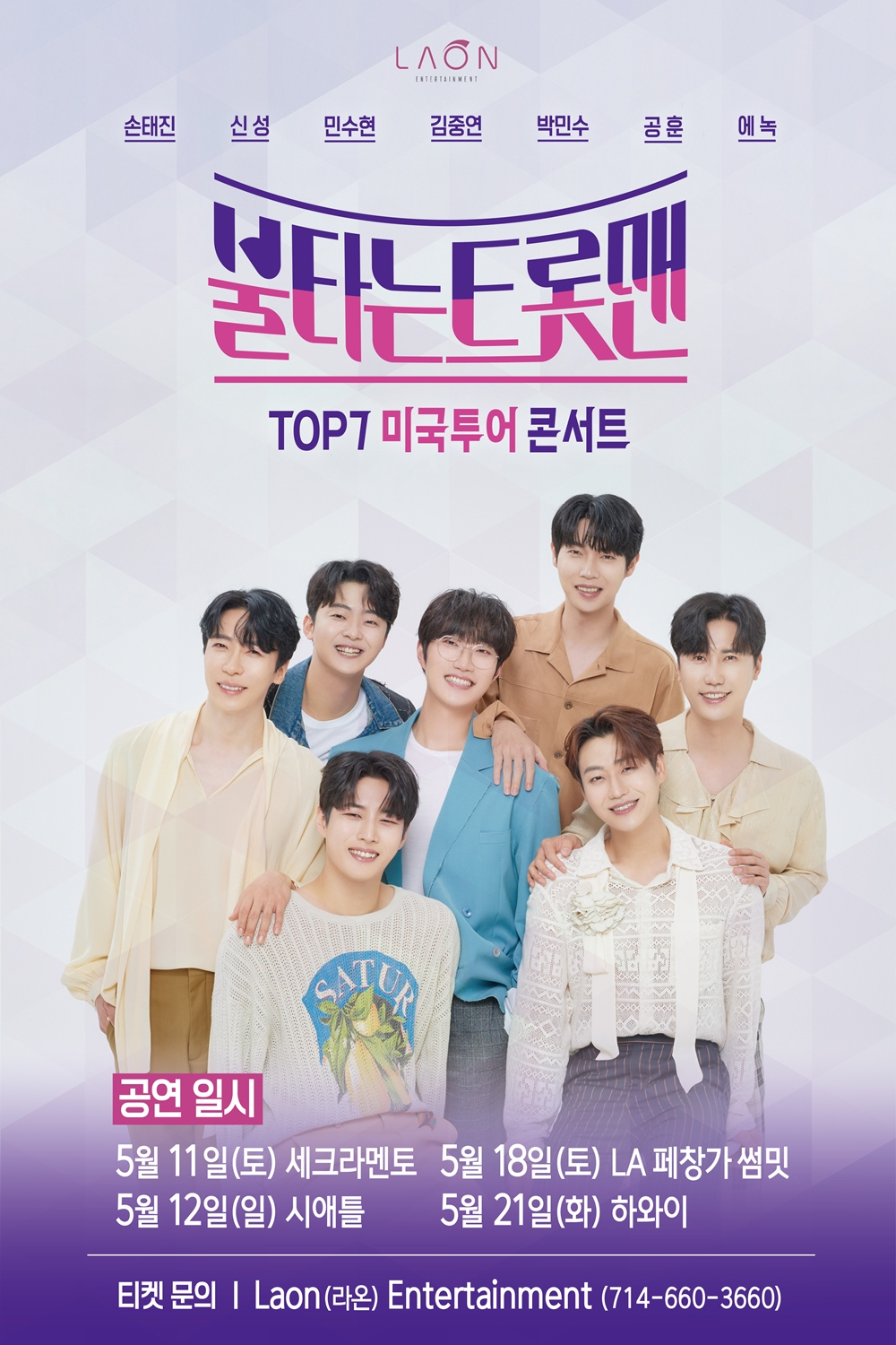 공개된 일정에 따르면 '불타는 트롯맨' TOP7은 오는 5월 11일 세크라멘토 캐쉬크릭을 시작으로 12일 시애틀, 18일 LA 페창가 썸밋, 21일 하와이 등 미국 4개 도시에서 공연을 갖고 현지 팬들을 만난다.