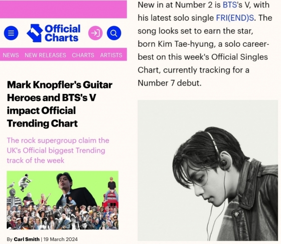 방탄소년단(BTS) 뷔의 신곡 '프렌즈'(FRI(END)S)가 영국 '오피셜 트렌딩 차트'에서 톱2에 오르며 글로벌 인기를 빛냈다.