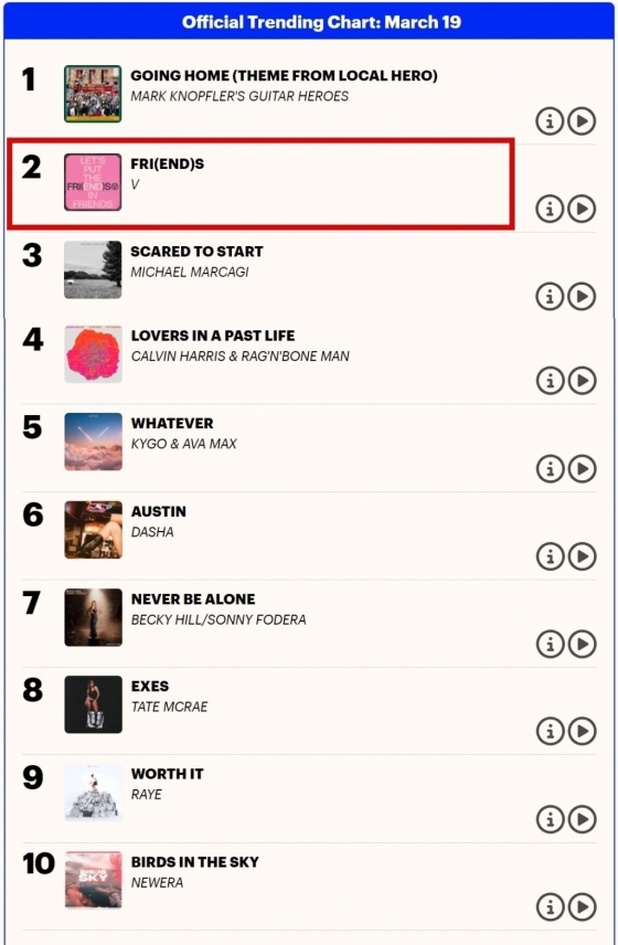 영국 오피셜 차트에 따르면 뷔의 'FRI(END)S'는 3월 넷째 주 '오피셜 트렌딩 차트' (UK's Official Trending Chart) 2위를 차지했다.