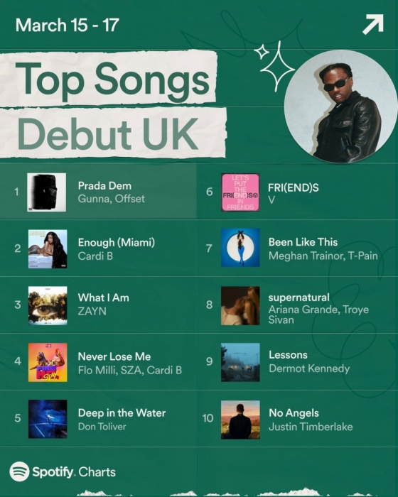 스포티파이에서도 'FRI(END)S'의 반응은 뜨겁다. 'FRI(END)S'는 영국 스포티파이 주간 차트(3월 15일~3월 17일)의 '톱 10 데뷔 송' 차트에서 6위에 올랐다. 'FRI(END)S' 현재 스포티파이에서 2760만 스트리밍을 기록하고 있다.
