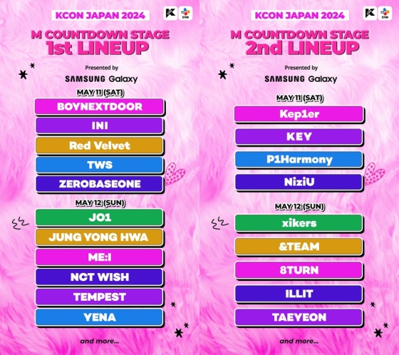 CJ ENM이 오는 5월 10일부터 5월 12일까지 3일간 일본 지바현에 위치한 마쿠하리 멧세와 조조마린 스타디움에서 열리는 'KCON(케이콘) JAPAN 2024'에는 앤팀(&TEAM), 8TURN(에잇턴), 보이넥스트도어(BOYNEXTDOOR), 아일릿(ILLIT), INI(아이앤아이), JO1(제이오원), 정용화(JUNG YONG HWA), 케플러(Kep1er), 키(KEY), ME:I(미아이), NCT WISH(엔시티 위시), 니쥬(NiziU), 피원하모니(P1Harmony), 레드벨벳(Red Velvet), 태연(TAEYEON), 템페스트(TEMPEST), TWS(투어스), 싸이커스(xikers), 최예나(YENA), 제로베이스원(ZEROBASEONE) 등 20팀이 출연한다.