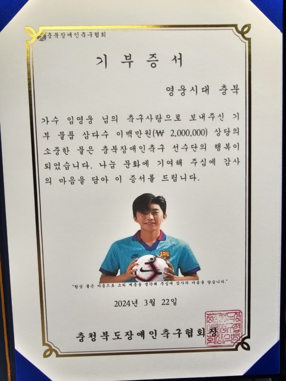 '영웅시대충북방'은 "평소 장애인 축구 발전과 지원을 위해 기부해 온 임영웅의 뜻에 함께 하고자 하는 회원들의 마음을 모아 기부하게 됐다"고 밝혔다.