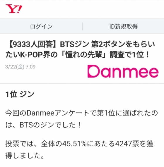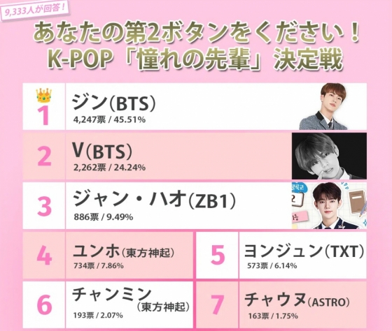 해당 설문조사에서 진은 총 투표수 9333표 중 4247표를 얻어 45.51%의 높은 득표율로 1위를 차지했다.
