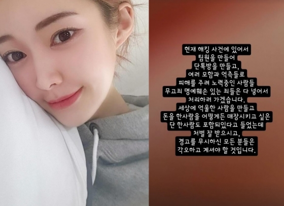 아름은 25일 "현재 해킹 사건에 있어서 팀원을 만들어 단톡방을 만들고, 여러 모함과 억측들로 피해를 주려 노력중인 사람들. 무고죄 명예훼손 있는 죄들은 다 넣어서 처리하러 가겠습니다"라고 글을 올렸다.