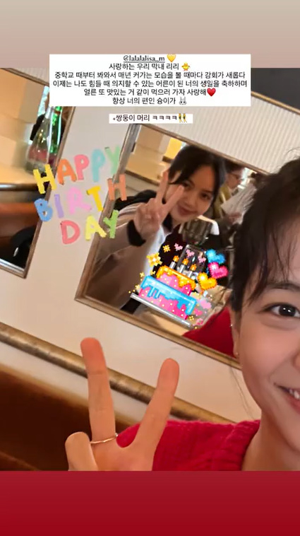지수도 리사와 똑같은 헤어스타일을 한 채 촬영한 셀카를 공개, "사랑하는 우리 막내 리리. 중학교 때부터 봐와서 매년 커가는 모습을 볼 때마다 감회가 새롭다. 이제는 나도 힘들 때 의지할 수 있는 어른이 된 너의 생일을 축하하며 얼른 또 맛있는 거 같이 먹으러 가자. 사랑해. 항상 너의 편인 슝이가"라며 리사를 향해 남다른 애정을 드러냈다.