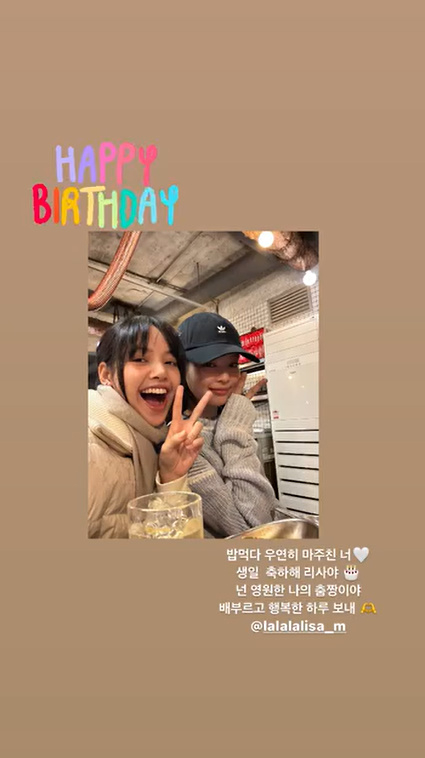 제니는 그동안 볼 수 없었던 미공개 셀카를 업로드했다. 그는 "밥 먹다 우연히 마주친 너♥ 생일 축하해 리사야. 넌 영원한 나의 춤짱이야. 배부르고 행복한 하루 보내"라며 리사와 함께 찍은 셀카 한 장을 공개했다.