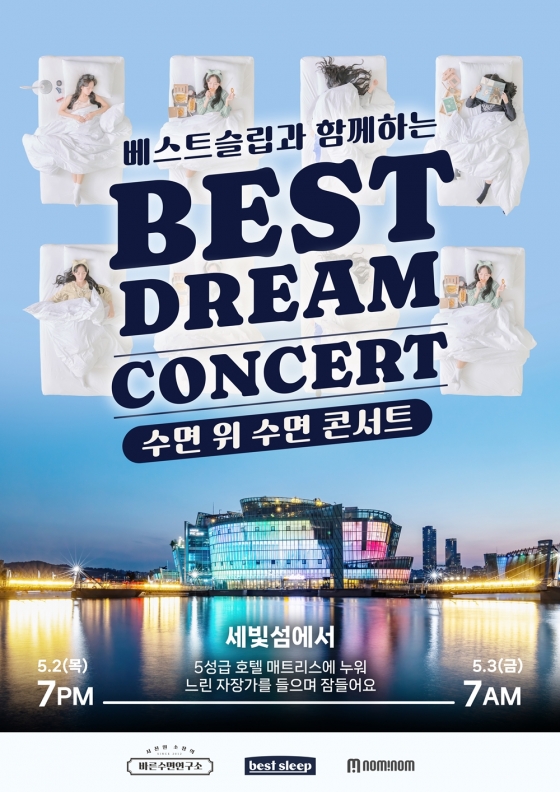 공연 주관사 노미놈에 따르면, 잠 부족에 시달리는 불면러들을 위한 '베스트드림콘서트'가 오는 5월 2일 오후 7시 서울 서초구 세빛섬 플로팅아일랜드에서 열린다.