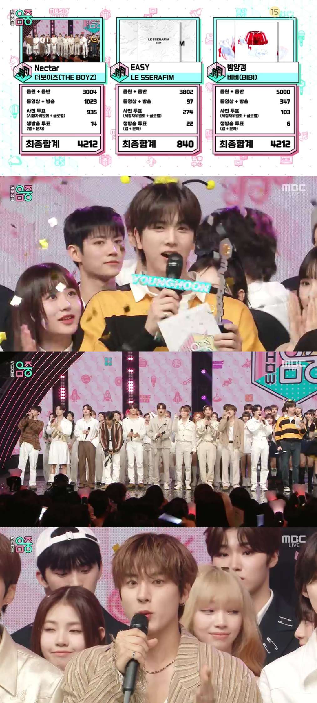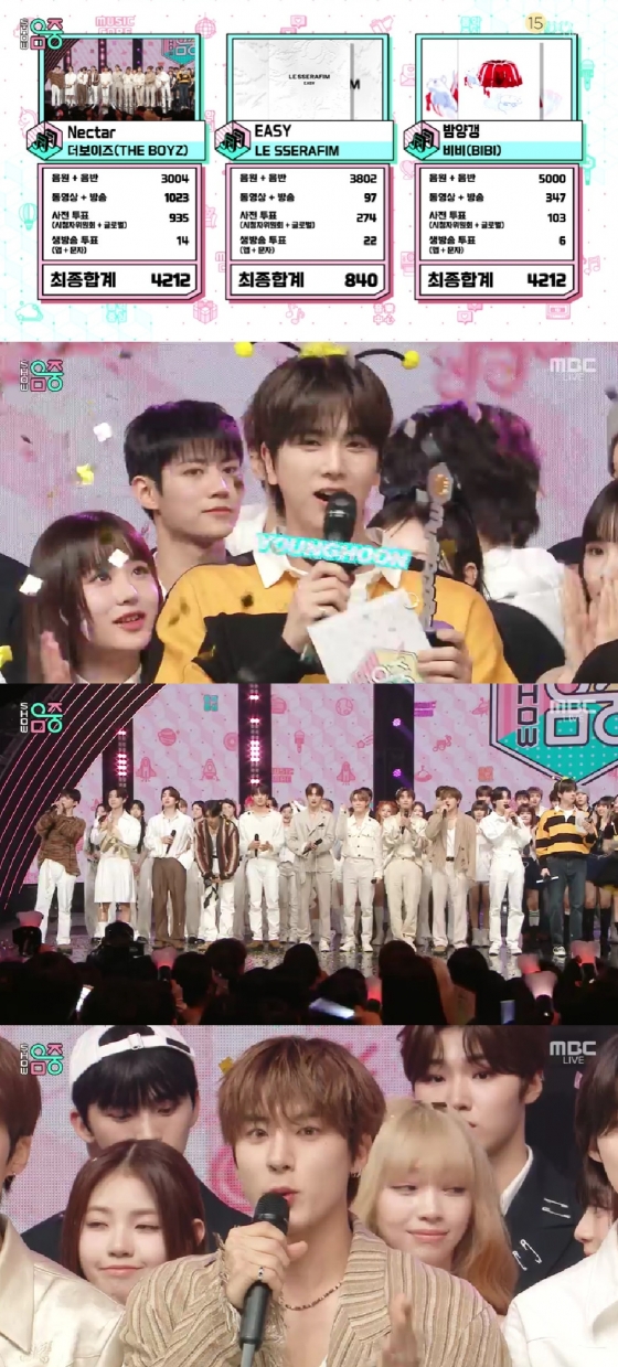 30일 방송된 MBC '쇼! 음악중심'에는 3월 마지막 주 1위 후보로 더보이즈의 'Nectar'(넥타), 르세라핌의 'EASY'(이지), 비비의 '밤양갱'이 올랐다.