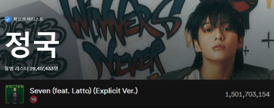 방탄소년단(BTS) 정국이 'Seven'(세븐)으로 스포티파이에서 15억 스트리밍을 경신하며 신기록 행진을 이어갔다.