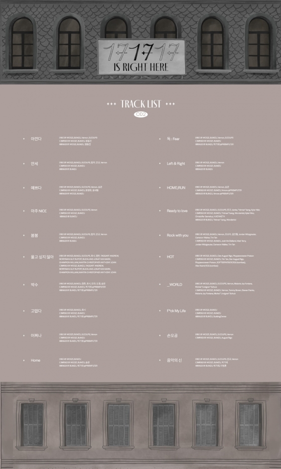 세븐틴은 4월 2일 공식 SNS에 오는 29일 오후 6시(이하 한국시간)에 발매되는 베스트 앨범 '17 IS RIGHT HERE'의 트랙리스트 히든 버전을 게재했다. CD1과 CD2로 구성된 트랙리스트 이미지는 세븐틴의 이름을 빛낸 역대 타이틀곡을 담고 있다. 영화 '그랜드 부다페스트 호텔' 오리지널 일러스트로 유명한 맥스 돌턴(Max Dalton)이 참여한 신보 앨범 커버 이미지를 활용한 것이 눈에 띈다.