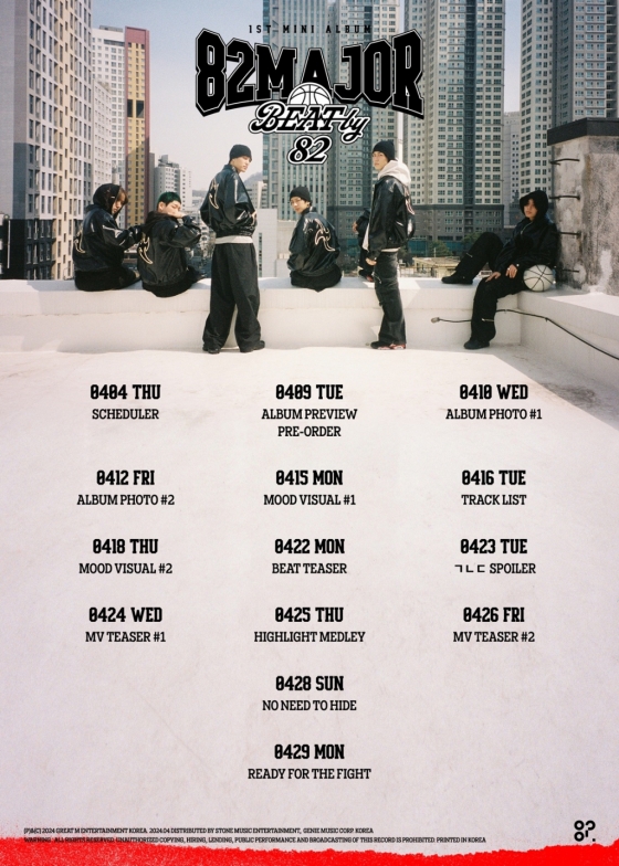공개된 이미지 상단에는 강렬한 블랙 착장으로 카리스마를 발산하는 82메이저 여섯 멤버의 모습이 담겼다. 여기에 앨범명 'BEAT by 82'의 텍스트와 힙합 감성이 물씬 느껴지는 농구공 로고가 함께 시선을 사로잡고 있다.