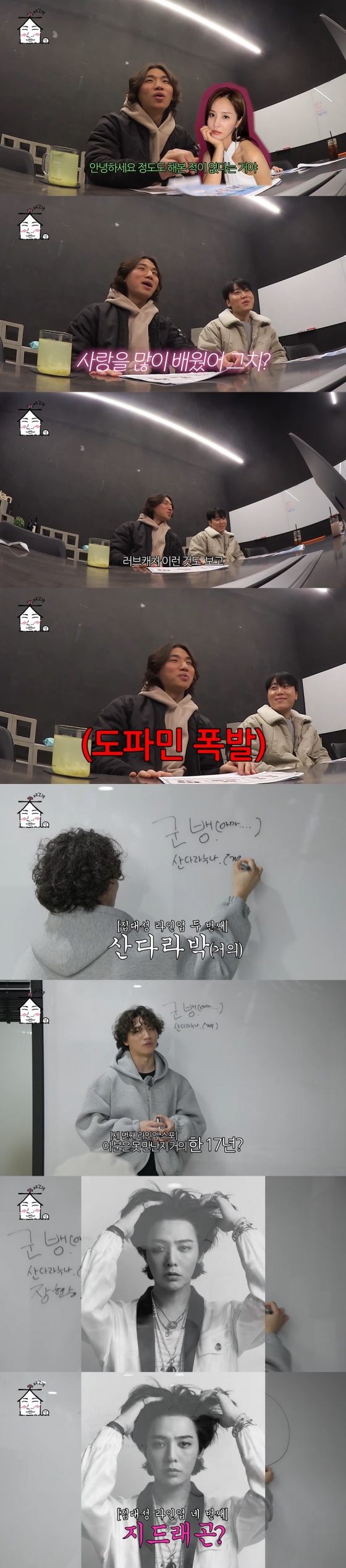대성은 또 칠판에 "쥐D"라고 적으며 지드래곤을 언급, "내 입으로 절대 (나와달라고) 말 못 하지. (지용이 형이 먼저) '야 너 재미있더라. 나 한번 불러줘'라고 하면 (내가) '어 형!' 그때 나는 말할 수 있다"라고 전했다.
