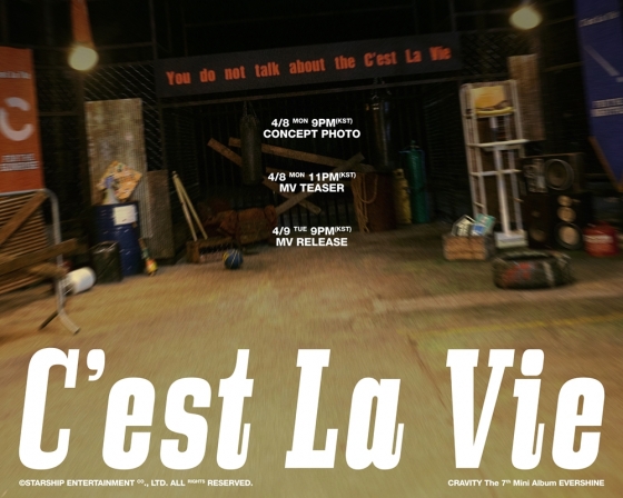 소속사 스타쉽엔터테인먼트는 지난 6일 크래비티(세림, 앨런, 정모, 우빈, 원진, 민희, 형준, 태영, 성민) 공식 SNS를 통해 일곱 번째 미니 앨범 '에버샤인(EVERSHINE)'의 수록곡 '세라비(C'est La Vie)' 커밍순 이미지를 공개했다.