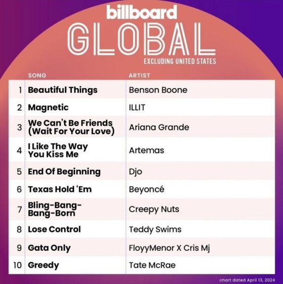 9일(현지 시간) 빌보드에 따르면 아일릿이 3월 25일 발표한 데뷔 앨범 '슈퍼 리얼 미'(SUPER REAL ME) 타이틀곡 '마그네틱'(Magnetic)은 2024년 4월 13일 자 빌보드 버블링 언더 핫100 차트 2위를 차지했다. 데뷔 15일 만의 성과로 아일릿의 이번 기록은 K팝 그룹 역대 최단 기간 진입이 됐다.