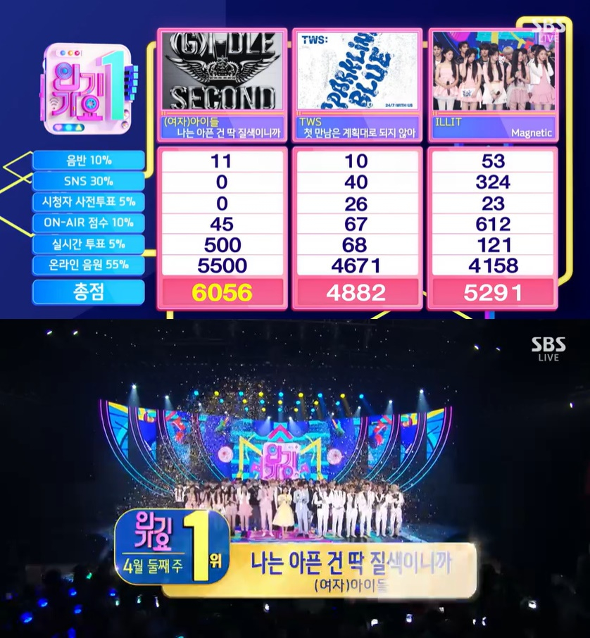 (여자)아이들은 이날 방송 출연 없이도 1위를 차지하며 인기를 입증했다.