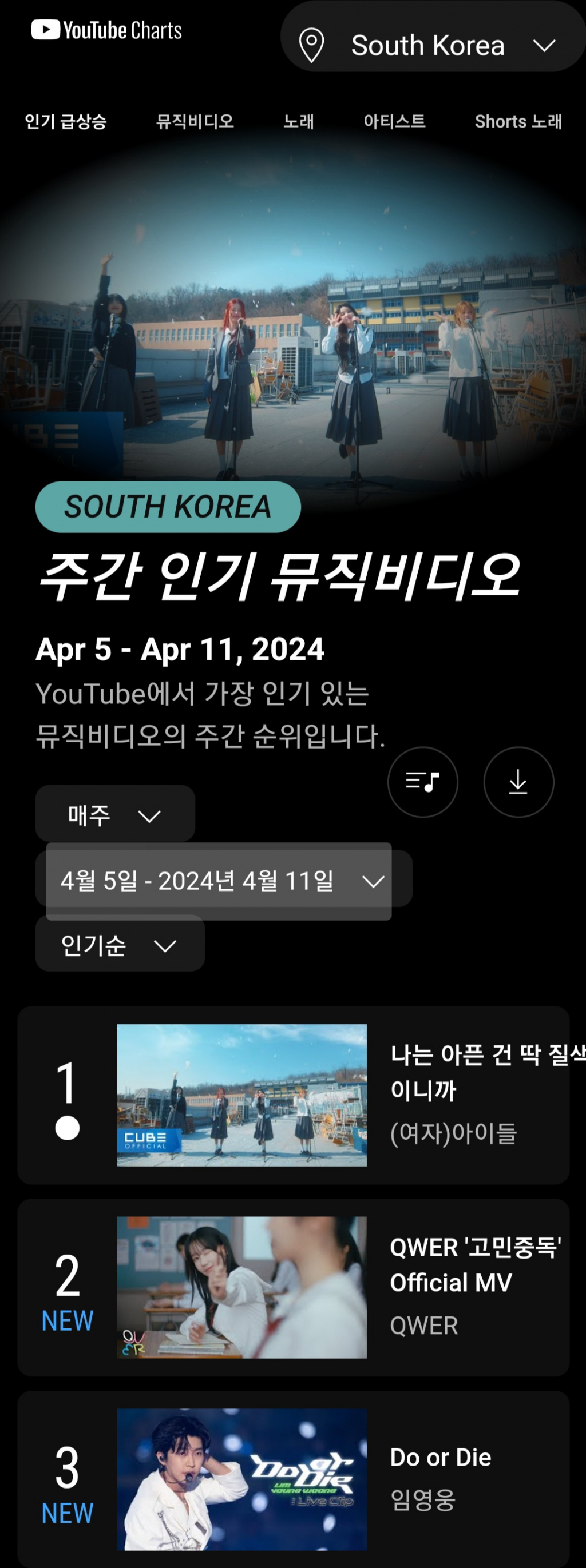 임영웅의 ''Do or Die' Live Clip. @2023 IMHERO CONCERT'는 2024년 4월 5일~2024년 4월 11일 유튜브 한국 주간 인기 뮤직비디오 차트 3위를 차지했다. 데뷔 첫 주 톱3 진입이라는 눈부신 성적을 이뤄냈다.