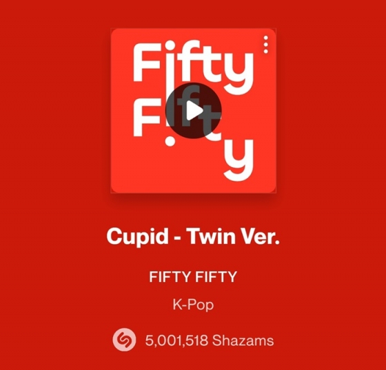 걸그룹 피프티 피프티(FIFTY FIFTY) 히트곡 'Cupid-Twin-ver.'가 K팝 여성 아티스트 최초로 Shazam(샤잠) 500만 청취를 돌파했다.