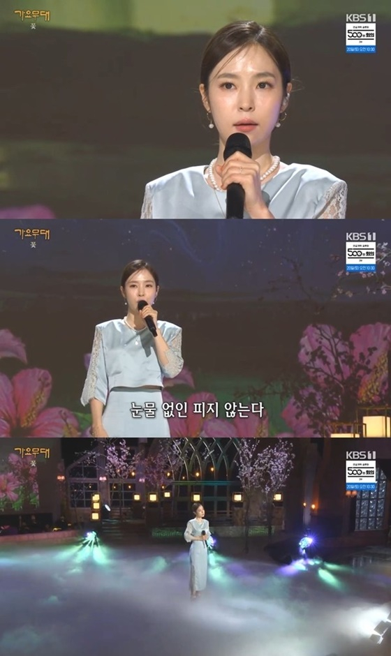 투피스 의상을 입고 단아한 매력을 뽐낸 홍자는 가슴을 절절하게 울리는 애절한 보이스로 '무궁화'를 열창하며 현장 관객들의 뜨거운 박수를 받았다.