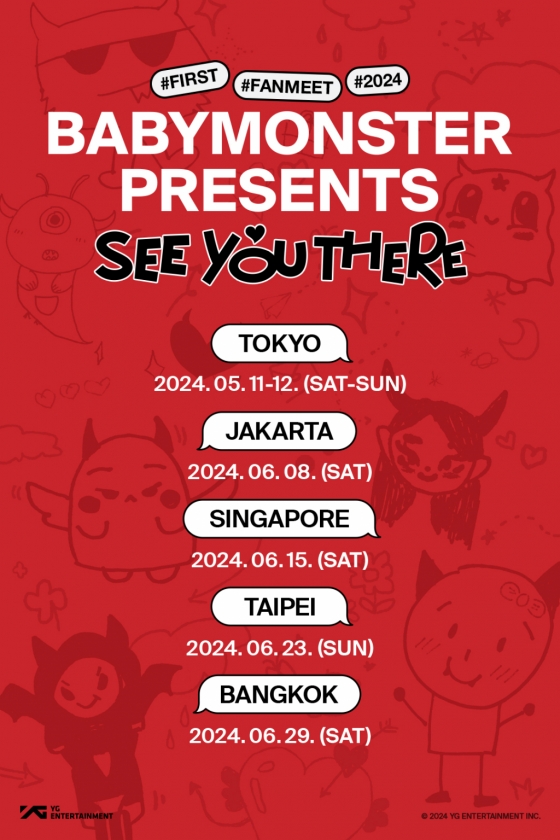 YG엔터테인먼트는 17일 공식 SNS에 'BABYMONSTER PRESENTS : SEE YOU THERE SCHEDULE'를 게재했다. 전 세계 팬들이 손꼽아 기다리던 아시아 5개 지역 팬미팅 투어의 일정이 마침내 베일을 벗은 것이다.