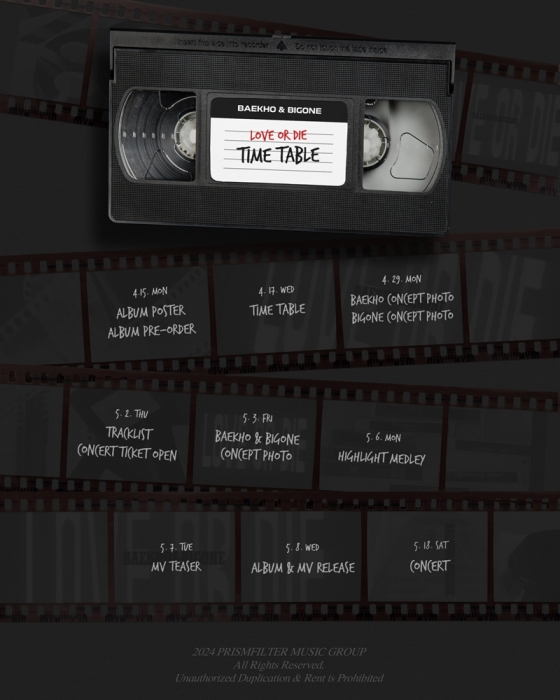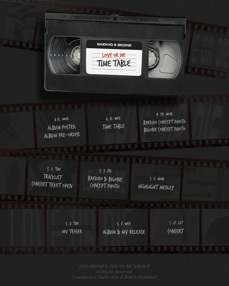 백호와 빅원은 지난 17일 공식 SNS에 싱글 'LOVE OR DIE'(러브 오어 다이)의 타임테이블을 게재했다. 공개된 사진에는 필름이 등장, 한 편의 영화 같은 이야기를 그려낼 두 아티스트의 모습을 예고한다.