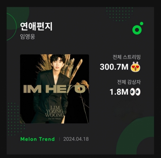 2022년 5월 2일 발매된 임영웅 첫 정규 앨범 'IM HERO' 수록곡 '연애편지'는 4월 18일 멜론에서 3억 스트리밍을 돌파했다. '연애편지'는 이날 기준 3억 70만 스트리밍을 기록했다. 공개 718일 만의 대기록이다.