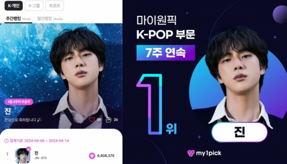 진은 마이원픽 'K-POP 부문' 4월 2주차(4월 8일~4월 14일) 투표에서 640만 8375개의 하트를 얻어 주간랭킹 1위를 차지했다.