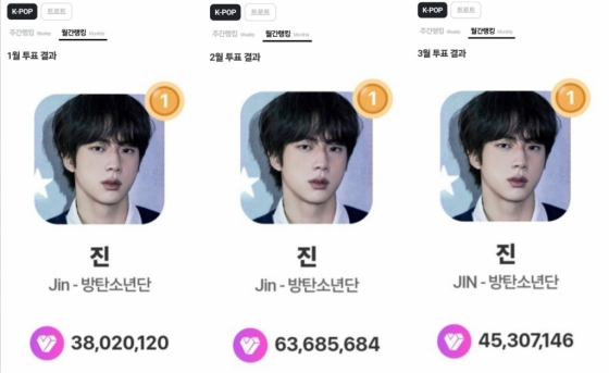 진은 올해 1월부터 3월까지 3개월 연속 월간랭킹 1위를 차지하였으며, 2월에 총 누적 6368만 5684개의 하트를 얻어 최고의 하트 수를 기록, 압도적인 인기를 보여줬다.