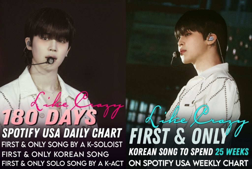 지민의 '라이크 크레이지'는 이로써 K팝 솔로곡 가운데 스포티파이 미국 일간 차트에 가장 오랜기간 차트인한 노래로 등극했다. 4월 18일 차트에서는 99위에 랭킹, 스포티파이 미국 일간차트 180일 차트인 기록을 세우며 'K팝 제왕'의 면모를 과시했다.