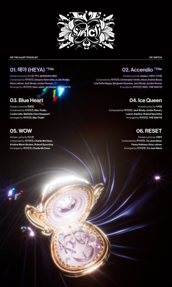 블랙 배경을 바탕으로 빛이 뿜어져 나오고 있는 여섯 가지의 보석이 담긴 케이스가 눈길을 사로잡고 있는 가운데 공개된 트랙리스트에 따르면, 아이브의 신보 '아이브 스위치'에는 더블 타이틀곡 '해야 (HEYA)'와 '아센디오(Accendio)'를 포함해 '블루 하트(Blue Heart)', '아이스 퀸(Ice Queen)', '와우(WOW)', '리셋(RESET)'까지 총 6개의 곡이 담겼다.