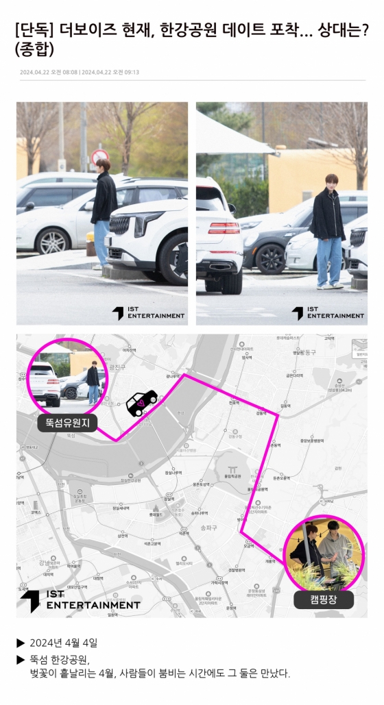 사진을 살펴보면 열애설을 자주 보도하는 한 매체의 기사 패턴을 그대로 베꼈다. 소속사는 멤버 현재가 2024년 4월 4일, 뚝섬 한강공원에서 누군가와 데이트를 즐겼다면서 파파라치 컷을 공개했다.