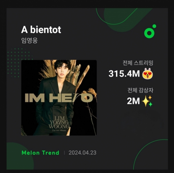 2022년 5월 2일 발매된 임영웅 첫 정규 앨범 'IM HERO' 수록곡 'A bientot'는 4월 23일 멜론에서 3억 1500만 스트리밍을 돌파했다. 'A bientot'는 이날 기준 3억 1540만 스트리밍을 기록했다.