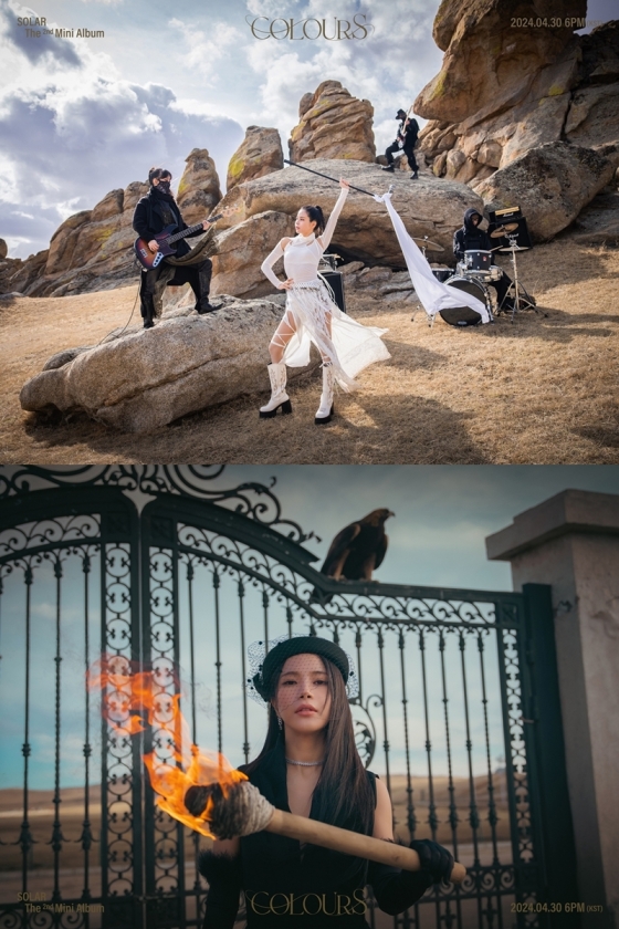 먼저 솔라는 웅장한 느낌의 바위들 앞에서 스탠드 마이크를 높이 들어 올린 포즈로 눈길을 끈다. 록 밴드 보컬로 변신한 솔라의 모습을 예고한 가운데, 위풍당당한 자태가 돋보인다. 이어 공개된 사진 속 솔라는 블랙 컬러의 드레스를 입고 고혹적인 매력을 자랑했다. 베일을 쓴 솔라는 타오르는 횃불을 든 채 카메라를 응시, 신비로운 분위기를 풍긴다.