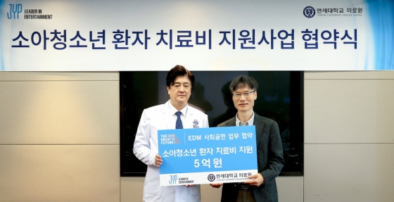 JYP엔터테인먼트가 연세대학교 의료원(이하 연세의료원)과 취약계층 아동청소년 환아 치료를 위한 협약을 체결하고 기부금 5억 원을 전달했다.