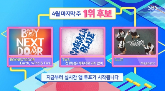 보이 그룹 보이넥스트도어, 투어스, 걸 그룹 아일릿이 '인기가요' 1위 후보에 올랐다.