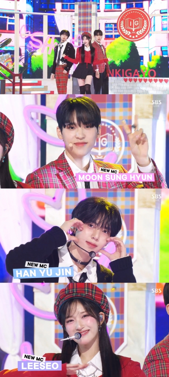 이날 '인기가요'는 대대적인 변화를 맞이했다. 약 2년 만에 MC 변화를 준 것. 새로운 MC로는 배우 문성현, 아이브 이서, 제로베이스원 한유진이 발탁됐다. 세 사람은 MC 신고식으로 f(x)의 '첫 사랑니 (Rum Pum Pum Pum)' 무대를 꾸몄다.
