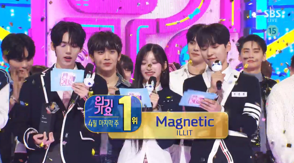 28일 오후 방송된 SBS '인기가요'에서는 보이넥스트도어와 투어스를 꺾고 4월 마지막 주 1위를 차지한 아일릿(윤아, 민주, 모카, 원희, 이로하)의 모습이 그려졌다. 다만 아일릿은 이날 '인기가요'에 출연하지 않았다.