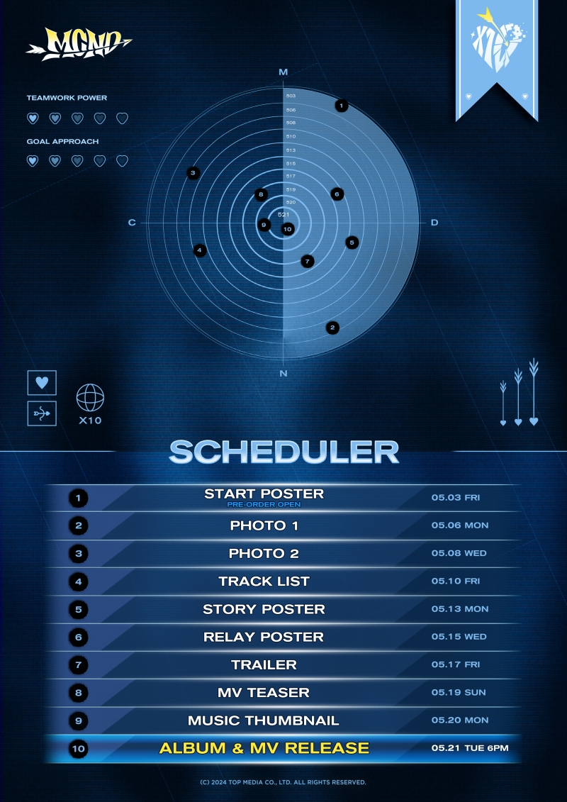공개된 스케줄러는 어두운 배경 속 과녁판에 'X10'의 티징 일정이 표시된 이미지로 단번에 이목을 사로잡았다. 양궁에서 과녁의 정중앙을 꿰뚫는 'X10'의 의미를 직관적으로 표현한 디자인이 업그레이드된 콘셉트와 매력으로 글로벌 팬심을 정조준해 최고가 되겠다는 MCND의 포부를 느끼게 했다.