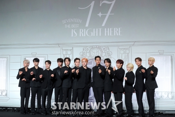 세븐틴(에스쿱스, 정한, 조슈아, 준, 호시, 원우, 우지, 디에잇, 민규, 도겸, 승관, 버논, 디노)은 29일 오후 서울 영등포구 콘래드 서울 그랜드볼룸에서 베스트 앨범 '17 IS RIGHT HERE' 발매 기념 글로벌 기자 간담회를 개최했다.