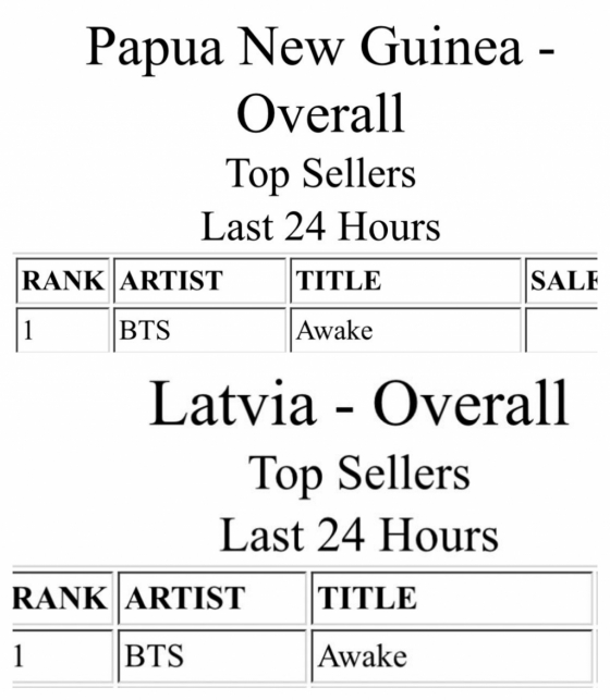 방탄소년단(BTS) 진의 솔로곡 '어웨이크'(Awake)는 지난 24일 라트비아(Latvia)에서 1위를, 같은 날, 온두라스(Honduras)에서 다시 한 번 더 1위에 올라 1위 재탈환을 기록하고, 멕시코에서도 테일러 스위프트에 이어 2위를 기록했다.
