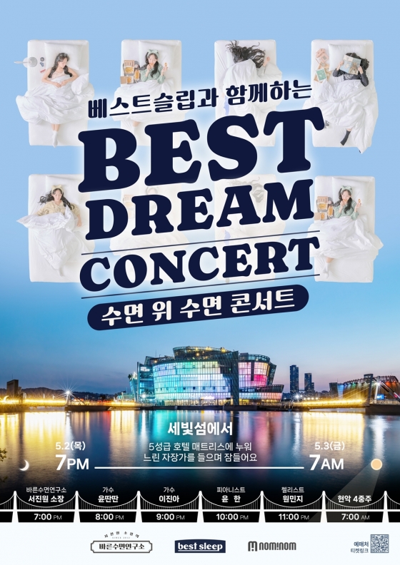 '베스트드림콘서트'는 오늘(2일) 오후 7시 서울 서초구 세빛섬 플로팅아일랜드에서 개최된다. 국내에서 최초로 진행되는 12시간 수면 콘서트 '베스트드림콘서트'는 지난 3월 얼리버드 티켓에 이어 4월 일반 예매까지 티켓 오픈과 함께 전석이 매진되며 큰 화제를 모았다.