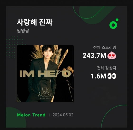 한편 임영웅은 오는 5월 25일~26일 서울월드컵경기장에서 2024 임영웅 콘서트 'IM HERO - THE STADIUM'(아임 히어로 - 더 스타디움) 공연을 펼친다. 임영웅은 이에 앞서 5월 6일 더블 싱글을 공개한다.