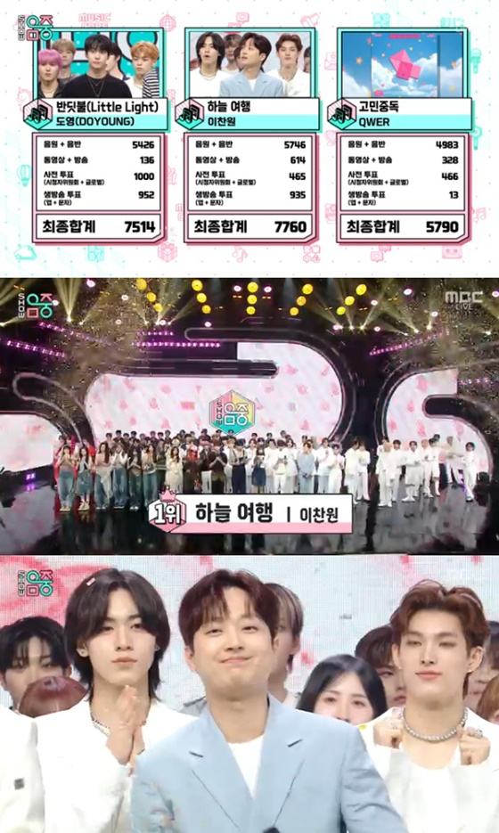 4일 방송된 '음악중심'에서는 그룹 NCT의 멤버 도영 '반딧불(Little Light), 이찬원 '하늘 여행', QWER '고민중독'이 1위 후보에 올랐다.