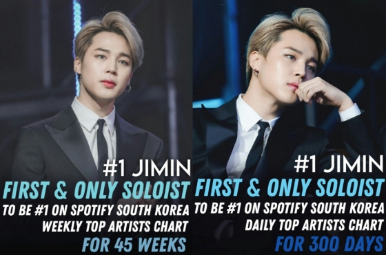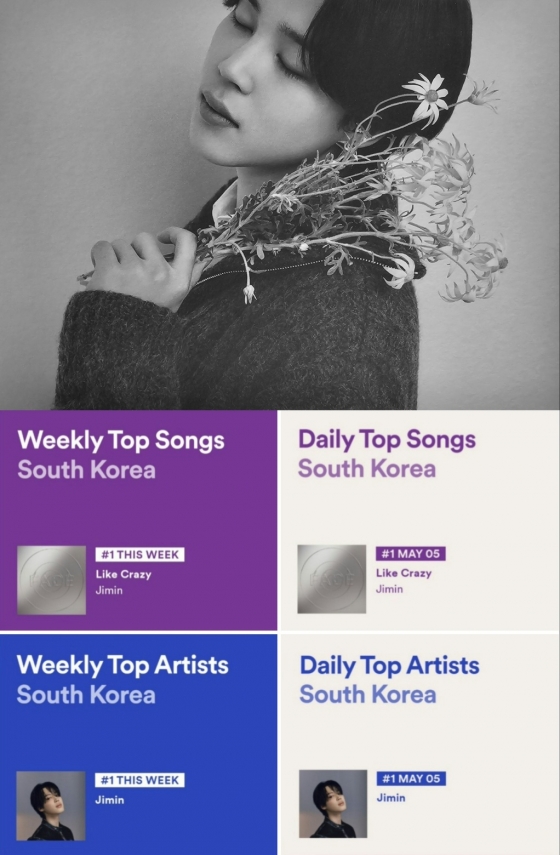 지민은 앞서 5월 3일 발표된 한국 스포티파이 주간 톱 아티스트 차트(4월 26일~5월 2일)에서도 1위에 오르며, 해당 차트에서 45주째 1위에 오른 최초이자 유일한 솔로이스트가 됐다.