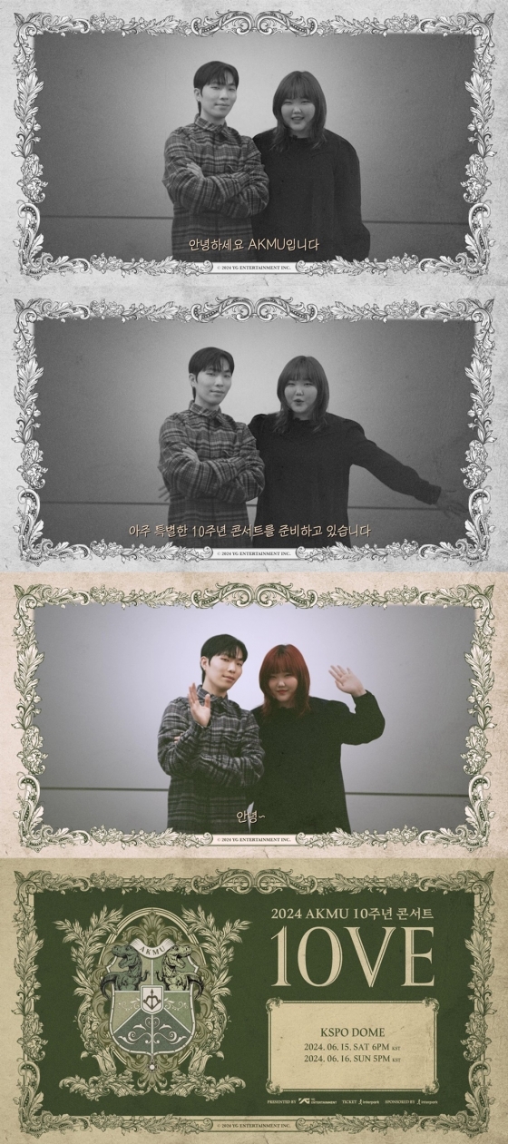 YG엔터테인먼트는 7일 AKMU 공식 SNS에 '2024 AKMU 10주년 콘서트 [10VE] MESSAGE VIDEO'를 게재했다. 오는 6월 15일·16일 서울 방이동 올림픽공원 KSPO DOME에서 관객들을 만나기에 앞서 영상을 통해 직접 공연 소개에 나선 것.
