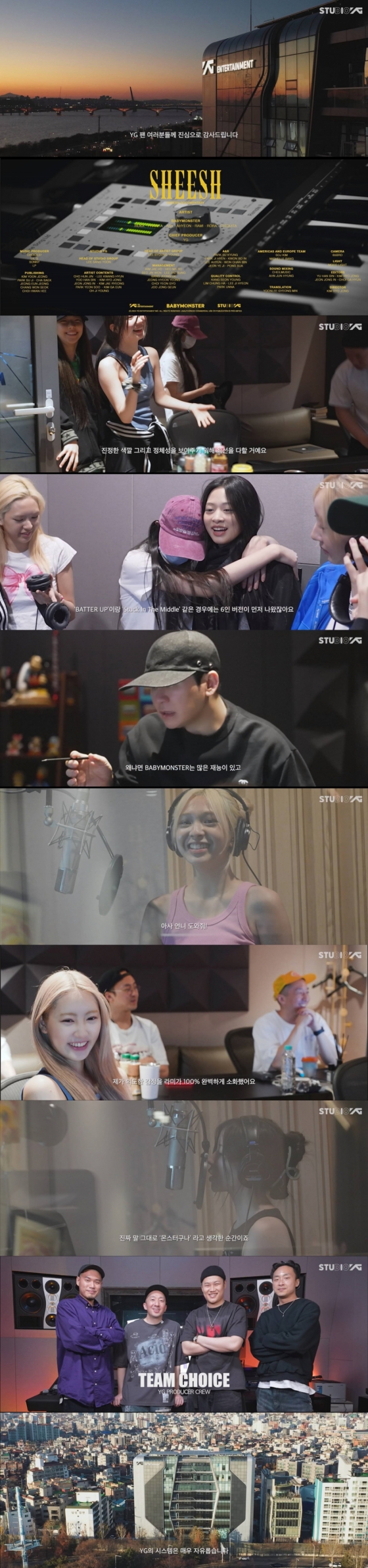 걸 그룹 베이비몬스터의 데뷔 앨범 'BABYMONS7ER'가 탄생되기까지 YG 프로듀서들과 멤버들의 노력과 열정을 엿볼 수 있는 'YG PRODUCTION EP.1 The Making of BABYMONSTER's "SHEESH"'가 9일 YG 공식 블로그를 통해 전격 공개됐다.