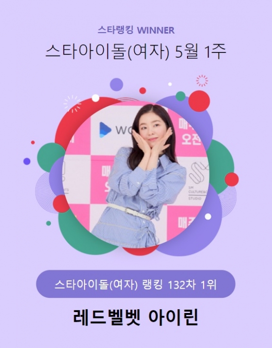 아이린은 지난 2일 오후 3시 1분부터 9일 오후 3시까지 진행된 5월 1주(132차) 스타랭킹 스타아이돌 여자 랭킹 투표에서 1만6469표를 얻어 1위를 차지했다.